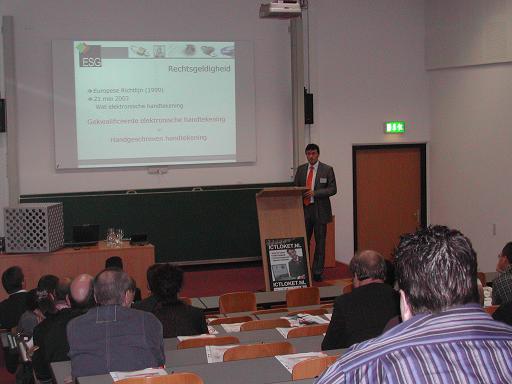 Vervolgens was de laatste spreker aan het woord namelijk de heer René Vaessen van IC3-Group/ ESG met het onderwerp digitale handtekening. Hij begon te vertellen over de betrouwbaarheid van communicatie over internet en communicatie over het internet bleek niet echt betrouwbaar te zijn. De oplossing is een digitale handtekening, met als doel; afsluiting, waardetoekenning, identificatie en is moeilijker te vervalsen. Hij vertelde over wetgeving, de wet elektronische handtekening, de soorten handtekeningen. Als voorbeeld werd de Smartcard met certificaat genoemd voor persoonlijke registratie en overdracht van het medium. De heer René Vaessen noemde voordelen, de toepassingsmogelijkheden en de taak van ESG.